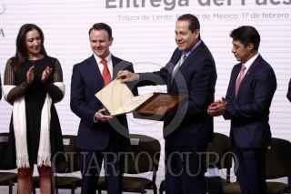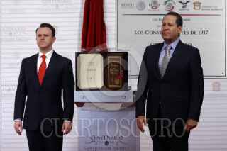 TOLUCA, ESTADO DE MÉXICO, 17FEBRERO2017.- Francisco Guzmán Ortíz, jefe de la oficina de la Presidencia de la República hizo entrega del facsímil de la Constitución Política de los Estados Unidos Mexicanos a Eruviel Ávila Villegas, gobernador del Estado de México. FOTO: ARTEMIO GUERRA BAZ / CUARTOSCURO.COM