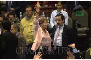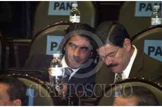 Jorge Kawaghi y Francisco Barrio, lìderes de las bancadas del PVEM y PAN, charlan antes de la votaciòn para discutir asuntos relacionados al FOBAPROA. FOTO: Juan Pablo Zamora/CUARTOSCURO.COM