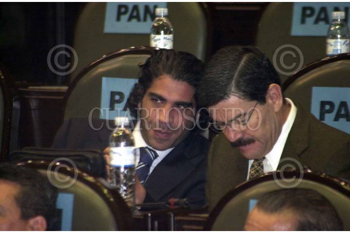 Jorge Kawaghi y Francisco Barrio, lìderes de las bancadas del PVEM y PAN, charlan antes de la votaciòn para discutir asuntos relacionados al FOBAPROA. FOTO: Juan Pablo Zamora/CUARTOSCURO.COM