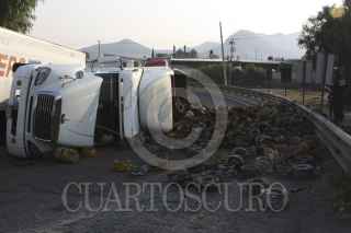 ECATEPEC ESTADO DE MÉXICO, Un tráiler que transportaba cilindros de gas reciclados se volcó sobre la avenida Recursos Hidráulicos en la incorporación a la autopista Lechería Texcoco dejando un saldo de dos personas lesionadas. FOTO: CORTESIA EDUARDO GALINDO /CUARTOSCURO.COM