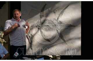 SAN PEDRO, GARZA GARCÍA, NUEVO LEÓN, 27FEBRERO2017.- El Alcalde y Empresario de San Pedro, Nuevo León, Mauricio Fernández presentó en su casa La Milarca, un fósil que es el primer ejemplar cretácico de los pliosaurios en México, y además nuevo en su género y especie. Fue encontrado en el municipio de Vallecillos, Nuevo León en 2011 en 28 piezas de roca. El Doctor investigador Wolfgang Stinnesbeck de la Universidad de Heidelberg, indicó que la antigüedad de la pieza es de alrededor de 93 millones de años, y ahora lleva al nombre de Mauriciosaurius Fernandezi como el nombre de su dueño y aportador para la investigación que llevó seis años. FOTO: CUARTOSCURO.COM
