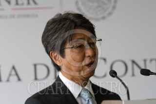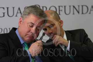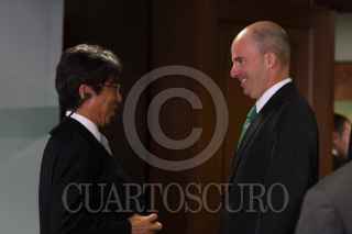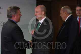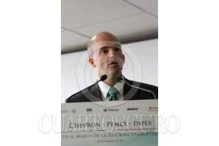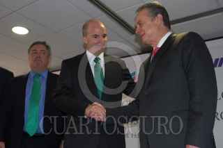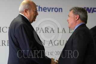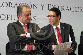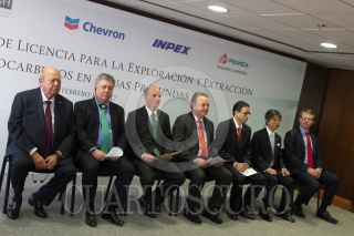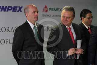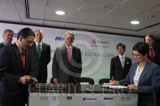 CIUDAD DE MÉXICO, 28FEBRERO2017.- Clay Neff, President, Chevron Africa & Latin America Exploration & Production Co.; José Antonio González Anaya, director de Pemex, y Pedro Joaquín Coldwell, secretario de Energía, durante la firma de licencia para la exploración y extracción de hidrocarburos en aguas profundas por parte de las empresas Chevron, Inpex y Pemex, en aguas profundas del Cinturón Plegado Perdido. FOTO: MOISÉS PABLO /CUARTOSCURO.COM