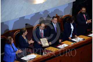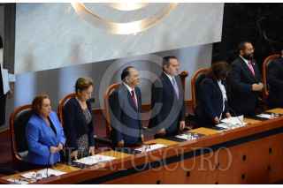 CHILPANCINGO, GUERRERO, 28FEBRERO2017.- Luis Enrique Miranda, secretario de Desarrollo Social, le entregó un facsímil de la Constitución de 1917 al Congreso del Estado, el ejemplar lo recibió el gobernador del estado Héctor Astudillo. FOTO: JOSÉ I. HERNÁNDEZ /CUARTOSCURO.COM