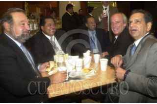 Carlos Slim acompañado del Gobernador de Tabasco, Manuel Andrade, y el Senador Fidel Herrera en un café del hotel donde se llevó a cabo el Seminario Internacional "El crecimiento económico y la Globalización". FOTO: Juan Pablo Zamora/CUARTOSCURO.COM