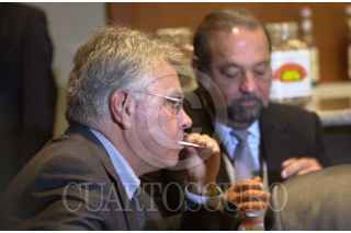 Felipe González, expresidente de España, y el empresario Carlos Slim platican en una cafeteria del hotel Sheraton Alameda de esta ciudad, previo al Seminario Internacional "El crecimiento económico y la Globalización" en el que ambos participaron. FOTO: Juan Pablo Zamora/CUARTOSCURO.COM