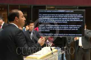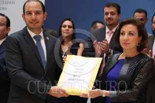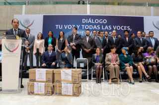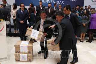 CIUDAD DE MÉXICO, 07FEBRERO2017.- Marko Cortez, coordinador del PAN acompañados de legisladores de su partido, entregaron 120 mil firmas ciudadanas a Guadalupe Murguía Gutiérrez presidenta de la mesa directiva de la Cámara de Diputados con el objetivo de reducir el 50 por ciento el Impuesto Especial sobre Producción y Servicios (IEPS) aplicado a gasolinas y diésel. FOTO: SAÚL LÓPEZ /CUARTOSCURO.COM