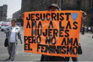 CIUDAD DE MÉXICO, 08MARZO2017.- Un hombre camina por las calles del centro histórico con un letrero alusivo a la conmemoración del Día Internacional de la Mujer. FOTO: DIEGO SIMÓN SÁNCHEZ /CUARTOSCURO.COM