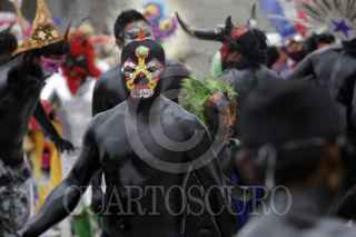 SAN NICOLÁS DE LOS RANCHOS, PUEBLA, 14MARZO2017.- En la tercera semana de cuaresma se realizó la tradicional fiesta del "adiós de la carne" en el poblado de San Nicolás de los Ranchos ubicado en las faldas del volcán Popocatépetl, donde hombres pintados o "Xinacates", recorren las calles con los cuerpos pintados a base de aceite comestible y pintura en polvo. Los "pintados" piden dinero intimidando a las personas que se encuentran a su paso ´pal baño o la cerveza" a cambio de no ser manchados. FOTO: HILDA RÍOS /CUARTOSCURO.COM
