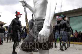 SAN NICOLÁS DE LOS RANCHOS, PUEBLA, 14MARZO2017.- En la tercera semana de cuaresma se realizó la tradicional fiesta del "adiós de la carne" en el poblado de San Nicolás de los Ranchos ubicado en las faldas del volcán Popocatépetl, donde hombres pintados o "Xinacates", recorren las calles con los cuerpos pintados a base de aceite comestible y pintura en polvo. Los "pintados" piden dinero intimidando a las personas que se encuentran a su paso ´pal baño o la cerveza" a cambio de no ser manchados. FOTO: HILDA RÍOS /CUARTOSCURO.COM