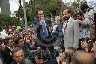 CIUDAD DE MÉXICO, 14MARZO2017.- Hugo Eri Flores Cervantes, estuvo presente durante el anunció de Cuauhtémoc Blanco, presidente municipal de Cuernavaca, Morelos, sobre su nueva afilicación al Partido Encuentro Social. Posterior a la rueda de prensa en el Hotel Hitlon, Cuauhtemoc y Hugo Eri, salieron a a saludar a sus seguidores en Alameda Central. FOTO: TERCERO DÍAZ /CUARTOSCURO.COM
