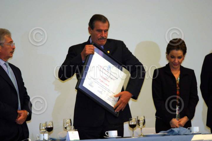 Vicente Fox entregó un reconocimiento al Doctor Guillermo Soberón, presidente emerito de la Fundación Mexicana para la Salud por su labor en este campo. FOTO: Juan Pablo Zamora/CUARTOSCURO.COM