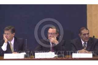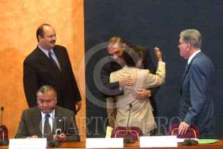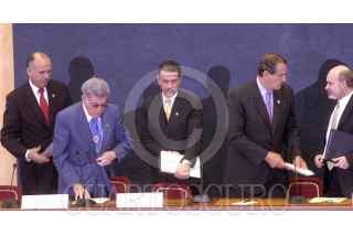 Javier Usabiaga, secretario de Agricultura, saluda a Heladio Ramírez, lider de la Conferederación Nacional Campesina, antes de dar inicio a la Sesión del Consejo para el Diálogo con los Sectores Productores. FOTO: Eunice Adorno CUARTOSCURO.COM
