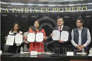 CIUDAD DE MÉXICO, 22MARZO2017.- La senadora Marcela Guerra Castillo, presidenta de la Comisión de Relaciones Exteriores América del Norte, firmó a nombre del Senado de la República un convenio con Luis Raúl González Pérez, presidente de la Comisión Nacional de Derechos Humanos, para proteger a los migrantes en retorno a nuestro país. FOTO: SENADO /CUARTOSCURO.COM