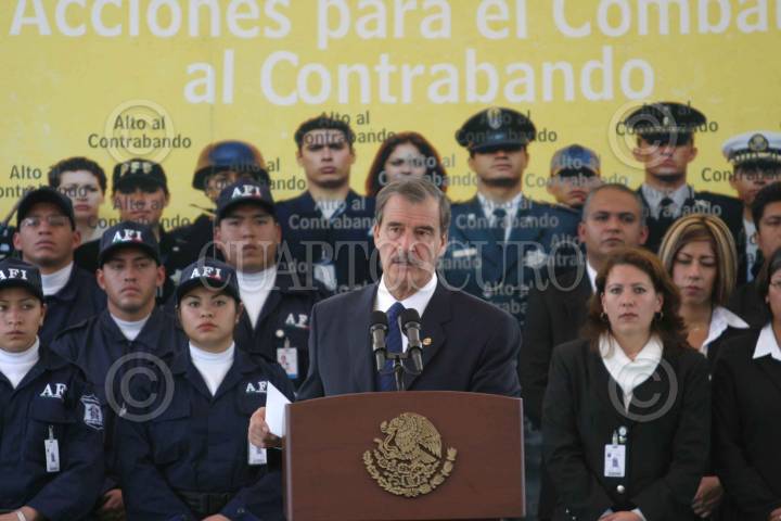 El presidente Vicente Fox, durante su participación en la presentación del programa Acciones para el Combate al contrabanado, que se llevó a cabo en las instalaciones de la AFI. FOTO:Nelly Salas/CUARTOSCURO.COM