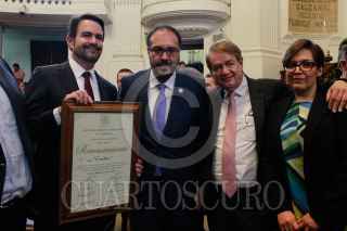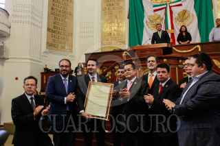 CIUDAD DE MÉXICO, 27MARZO2017.- En sesión solemne, la Asamblea Legislativa del Distrito Federal (ALDF) entregó reconocimiento al periódico "Excélsior", por sus primeros 100 años. La propuesta la hizo el diputado Mauricio Alonso Toledo, a través de un punto de acuerdo que presentó en tribuna; los legisladores hicieron la entrega a Pascal Beltrán del Río, Director Editorial del periódico. En la imagen, con el columnista Francisco Garfías. FOTO: CARLOS MARURI /ALDF/CUARTOSCURO.COM
