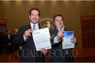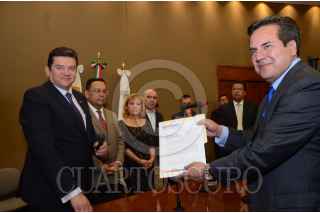 TOLUCA, ESTADO DE MÉXICO, 27MARZO2017.- Víctor Hugo Sondón, dirigente Estatal del PAN, y Alfonso Bravo Alvarez Malo, representante panista ante el Instituto Electoral del Estado de México (IEEM) realizaron la entrega de su plataforma electoral ante el Consejero Presidente Pedro Zamudio Godínez. FOTO: ARTEMIO GUERRA BAZ /CUARTOSCURO.COM