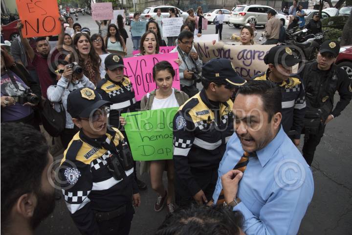 CIUDAD DE NÉXICO, 28MARZO2017.- Diversas organizaciones feministas bloquearon las calles aledañas de la representación del gobierno de Veracruz en la capital, para protestar en contra del amparo que un juez federal concedió a Diego Cruz, uno de los "porkys" acusados de la violación de ka Dafne N. Posterior al dicho bloqueo, las manifestantes se trasladaron a un semáforo de Insurgentes para mostrar sus pancartas y gritas consignas a los automovilistas y transeúntes. FOTO: TERCERO DÍAZ /CUARTOSCURO.COM