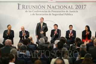 CIUDAD DE MÉXICO, 28MARZO2017.- Renato Sales, Comisionado Nacional de Seguridad; Raúl Cervántes, Procurador General de la República; Miguel Ángel Osorio Chong, secretario de Gobernación, y Pablo escudero, presidente de la mesa directiva del Senado de la República, durante la 1a Reunión Nacional 2017 de las Conferencias de Procuración de Justicia y de Secretarios de Seguridad Pública. FOTO: PGR /CUARTOSCURO.COM