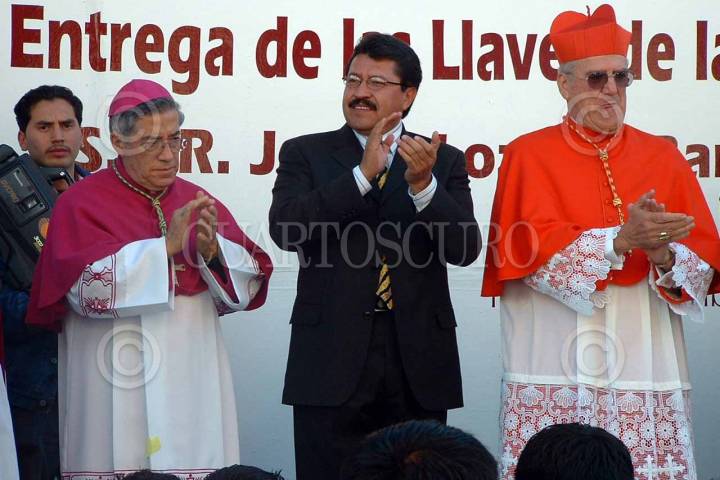 Zacatecas, Zacatecas 18DICIEMBRE2003.- El cardenal Javier Lozano Barran de visita a esta ciudad en donde recibio las llaves de la ciudad de manos del gobernador Ricardo Monreal Avila y el obispo del Estado Fernando Chavez Ruvalcaba. FOTO: Leonardo Garza Treviño/CUARTOSCURO.COM