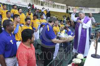VILLAHERMOSA, TABASCO, 29MARZO2017.- El padre Avelino oficio una misa en el estadio de beisbol Centenario del 27 de Febrero, para que en la presente temporada de LMB la novena local Olmecas de Tabasco tenga una buena temporada. FOTO: MARCO POLO GUZMÁN HERNÁNDEZ /CUARTOSCURO.COM