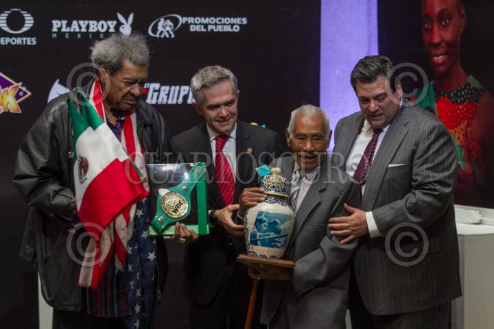CIUDAD DE MÉXICO, 30MARZO2017.- El ex púgil Enrique García recibió un reconocimiento por parte de la Ciudad de México, durante la presentación de la magna función de boxeo, que se realizará el próximo 1 de abril en la plancha del Zócalo. Lo acompañan Don King, Miguel Ángel Mancera, y Mauricio Sulaimán. FOTO: MOISÉS PABLO /CUARTOSCURO.COM