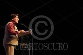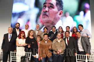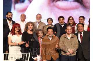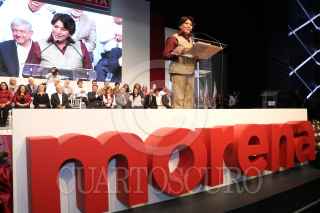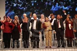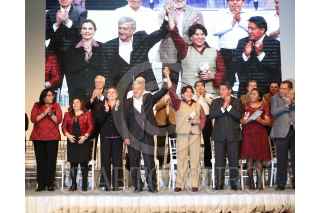 TOLUCA, ESTADO DE MÉXICO, 03ABRIL2017.- Delfina Gómez, candidata a la gubernatura del Estado de México por MORENA, acompañada de Andrés Manuel López Obrador y senadores que hace unos días dejaron la bancada del PRD en el Senado de la República, realizaron una reunión con la militancia en el teatro Morelos como parte del inicio de su campaña electoral. FOTO: SAÚL LÓPEZ /CUARTOSCURO.COM