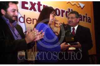 México, D.F,21Ene2004.- Yeidckol Polevnsky, presidenta de la CANACINTRA momentos después de otorgarle un reconocimiento por parte de Rafael Savedra representante de las empresas restauranteras de la ciudad de México, dentro de la reunión extraordinaria de la CANIRAC. FOTO: Eunice Adorno/CUARTOSCURO.COM