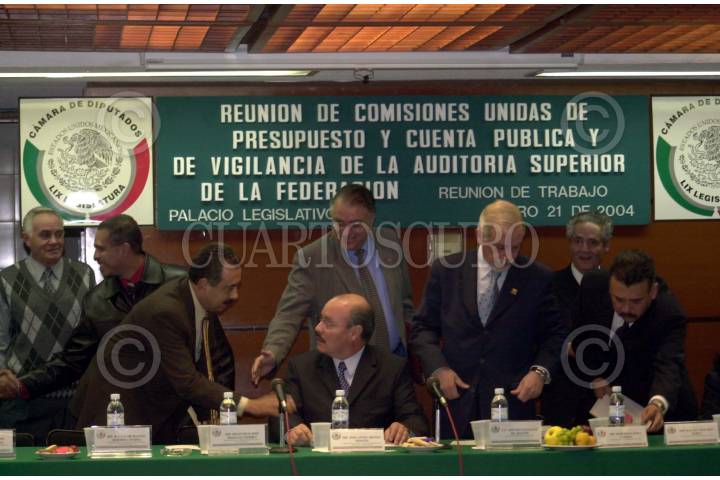México D.F. 21 ENERO 2004.- La diputada perredista Dolores Padierna (izq) y el priísta Roberto Campa (der) durante la reunión de trabajo que sostuvieron con Arturo González de Aragón, auditor superior de la federación en San Lázaro. FOTO: Sandra Perdomo/CUARTOSCURO.COM