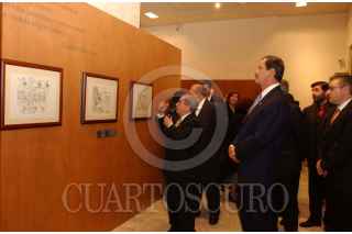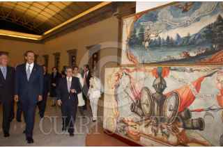 México, D.F. 22ENERO2004.- El presidente Vicente Fox, recorrió la exposición temporal Iberoamérica Mestiza, que se encuentra en el Castillo de Chapultépec. En la imagen Miguel León Portilla, director científico de la exposición le comenta las obras al primer mandatario. FOTO: PRESIDENCIA/CUARTOSCURO.COM