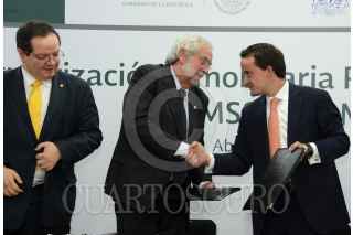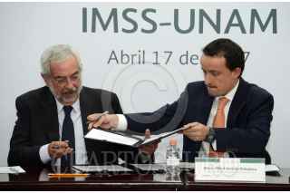 CIUDAD DE MEXICO, 17ABRIL2017.- El Rector de la Universidad Nacional Autónoma de México (UNAM), Enrique Graue Wiechers y el Director General del Instituto Mexicano del Seguro Social (IMSS), Mikel Arriola Peñalosa, firmaron el convenio para regularizar el predio donde se encuentra asentado el plantel número 9 de la Escuela Nacional Preparatoria “Pedro de Alba”, ubicada a un costado del Hospital Magdalena de las Salinas. El procedimiento para regularizar la sede de este plantel culmina hoy con las gestiones que autorizó el H. Consejo Técnico del IMSS, para transmitir la propiedad del predio en favor de la Máxima Casa de Estudios del país. FOTO: UNAM /CUARTOSCURO.COM