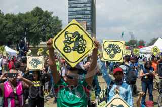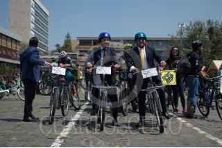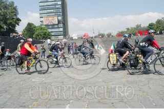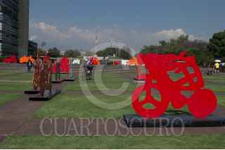 CIUDAD DE MÉXICO, 19ABRIL2017.- En las Islas de Ciudad Universitaria de la Universidad Nacional Autonóma de México (UNAM) se inauguró el sexto Foro Mundial de la Bicicleta. César Iván Astudillo, secretario de atención a la comunidad universitaria, y el artista plástico Gilberto Aceves Navarro, quien elaboró más de 50 esculturas de metal que se instalaron en las inmediaciones de la rectoría, estuvieron presentes en el acto. Las actividades del Foro Mundial se desarrollarán en distintos puntos de la ciudad. FOTO: SELENE PACHECO /CUARTOSCURO.COM