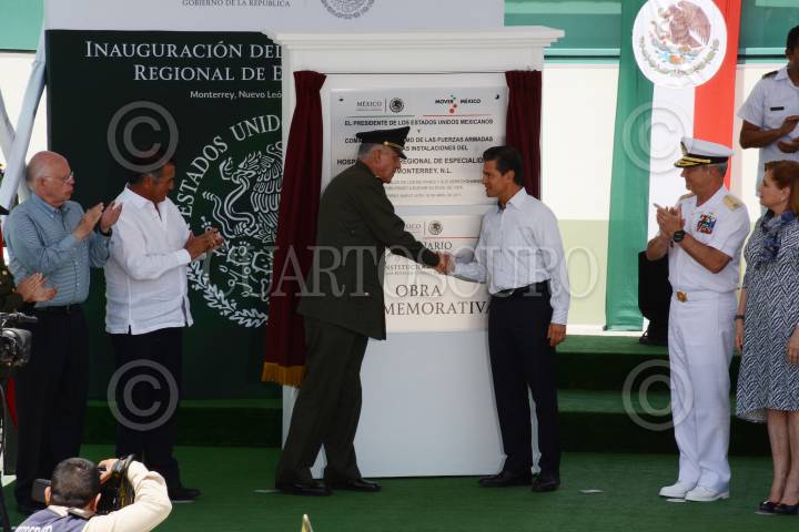 MONTERREY, NUEVO LEÓN, 19ABRIL2017.- Salvador Cienfuegos, secretario de la Defensa; Enrique Peña Nieto, Presidente de México, y Vidal Francisco Soberón Sanz, secretaria de la Marina, durante la inauguración del nuevo Hospital Regional Militar de Alta Especialidad, ubicado en la Plaza Monterrey Nuevo León. El hospital beneficiará a más de 95 mil personas, ya sean militares o derechohabientes. FOTO: MARIO JASSO /CUARTOSCURO.COM