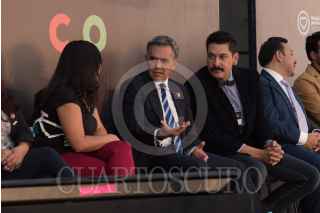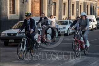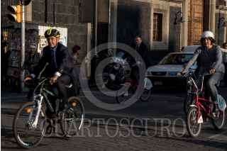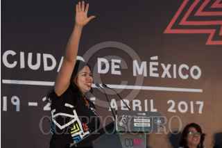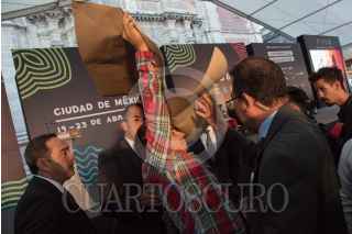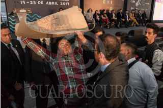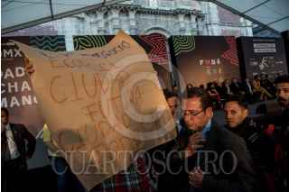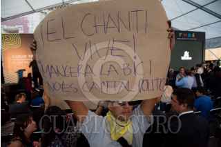 CIUDAD DE MÉXICO, 19ABRIL2017.- Durante la inauguración del Sexto Foro Mundial de la Bicicleta, en la que estuvo presente Miguel Ángel Mancera Espinosa, jefe de gobierno dela CDMX, manifestantes se presentaron con pancartas que decían “Bici Negocio EcoBici Ciudad Futura Ciudad Podrida” y “El Chanti Vive, Mancera la bici no es capital político”. Durante algunos minutos guardias de seguridad del jefe de gobierno intentaron retirar a los manifestantes pero se contuvieron de usar la fuerza por el apoyo de algunos asistentes. FOTO: TERCERO DÍAZ /CUARTOSCURO.COM