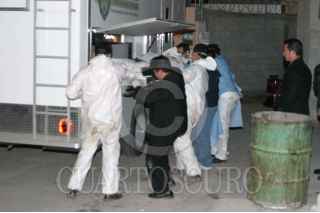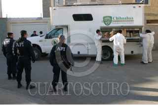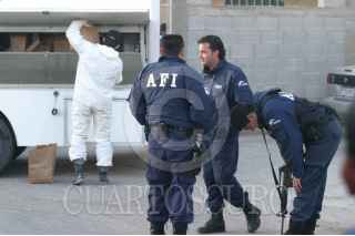 Cd. Juarez, Chihuahua 24ENE2004.- Custodiados por personal de la gencia Federal de Investigaciones -AFI- personal del SEMEFO trasladan una serie de bolsas que contienen parte de los restos humanos de lo que es el tercer cadaver hallado sepultado en el patio trasero de una casa de la que ayer por la noche fueron exhumados otros dos cuerpos hoy por la madrugada. La casa fue cateada por la AFI luego de que recibieran una denuncia anonima en la que alguno de los vecinos reporto la presencia de olores fetidos asi como de comportamientos extranos de las personas que alli habitaban. Cabe destacar la presencia de agentes del FBI quienes se coordinaron para realilzar los peritajes en el lugar del hallazgo. Foto: JGuadalupe Perez/CAURTOSCURO.COM