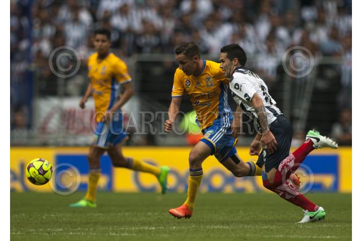 MONTERREY, NUEVO LEÓN, 22ABRIL2017.- Efraín Juárez del equipo de los Rayados del Monterrey se disputa el balón con Damián Álvarez del equipo de los Tigres de la UANL en el estadio BBVA Bancomer, en el Clásico Regio 110, partido correspondiente a la jornada 15 de la Liga MX, Clausura 2017. Marcador Final: Monterrey: 1 - Tigres: 0 FOTO: GABRIELA PÉREZ MONTIEL /CUARTOSCURO.COM
