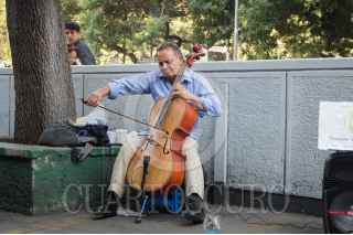 CIUDAD DE MÉXICO, 25ABRIL2017.- Un vilonchelista se ubica a las afueras de metro Etiopía para interpretar canciones a cambio de algunas monedas. El auge de los músicos urbanos, en la zona centro de la ciudad, obligó a las autoridades a establecer lugares y horarios para los artistas. FOTO: SELENE PACHECO /CUARTOSCURO.COM
