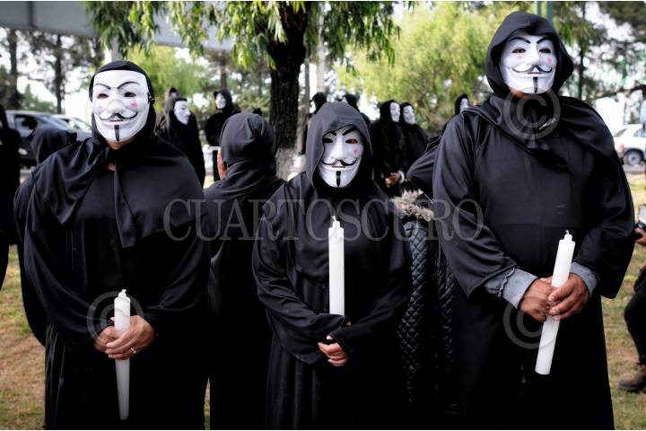 TOLUCA, ESTADO DE MÉXICO, 25ABRIL2017.- Un grupo de 60 personas disfrazadas de “Anonymous” desplegaron mantas en contra de tres candidatos a gobernador del Estado de México; Alfredo del Mazo, Josefina Vázquez Mota y Delfina Gómez, frente al Instituto Electoral del Estado de México (IEEM) en donde se llevará a cabo el primer debate entre los candidatos. FOTO: DIEGO SIMÓN SÁNCHEZZ /CUARTOSCURO.COM