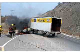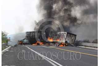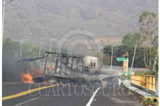 CHILPANCINGO, GUERRERO, 25ABRIL2017.- Estudiantes de la normal rural "Raúl Isidro Burgos de Ayotzinapa" incendiaron dos camionetas de carga de la empresa Coppel; el primer vehículo lo incendiaron en el punto conocido como Tierras Prietas, sobre el libramiento de cuota Chilpancingo Tixtla, el segundo vehículo fue pasando la caseta de cobro de Peaje donde converge el libramiento con la carretera Tixtla Chilapa. La acción trascendió fue por el desalojo qué sufrieron los padres de familia de los 43 cuando se manifestaban en las inmediaciones de la Secretaría de Gobernación en la Ciudad de México. Cuerpos policiacos mantienen vigilancia en el nuevo libramiento. FOTO: JOSÉ I. HERNÁNDEZ /CUARTOSCURO.COM