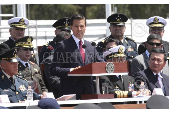 TECÁMAC, ESTADO DE MÉXICO, 26ABRIL2017.- El Presidente Enrique Peña Nieto encabezó la inauguración de la Feria Aeroespacial México 2017 en la Base Aérea Militar de Santa Lucía donde dijo que gracias al trabajo coordinado entre industria, academia y autoridades, el sector aeroespacial se ha convertido en uno de los más dinámicos y estratégicos de nuestra economía. FOTO: PRESIDENCIA /CUARTOSCURO.COM