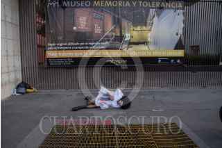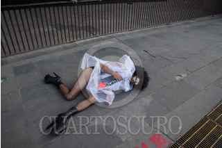 CIUDAD DE MÉXICO, 26ABRIL2017.- Un hombre con vestimenta de mujer, autonombrado "Drag", realizó un performance simulando estar muerto afuera del Museo Memoria y Tolerancia, para protestar en contra del sitio, ya que según la persona se le negó el acceso por su apariencia al intentar ingresar para visitar una exposición de feminicidios. Coloquialmente la palabra "Drag" se refiere al uso de ropa del sexo opuesto FOTO: TERCERO DÍAZ /CUARTOSCURO.COM