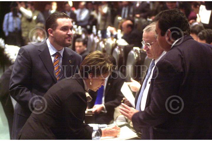 México D.F 25 FEB2004.- Los diputados Fermín Trujillo, (PRI), Guillermo Martínez Nolasco, (PRI) y Margarita Zavala, (PAN), antes de comenzar la reunión de trabajo de la Defensa Nacional. FOTO: Eunice Adorno/CUARTOSCURO.COM