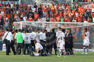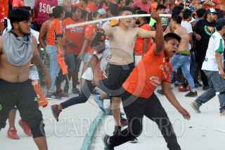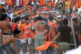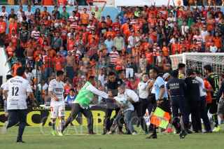 TUXTLA GUTIERREZ, CHIAPAS, 29ABRIL2017.- Afición del equipo Jaguares de Chiapas, ingresó al campo de juego cuando el equipo empataba dos a dos contra Santos, elementos de la Policía Estatal repeló la agresión, dos elementos resultaron con heridas leves. FOTO: JESUS GARCIA /CUARTOSCURO.COM