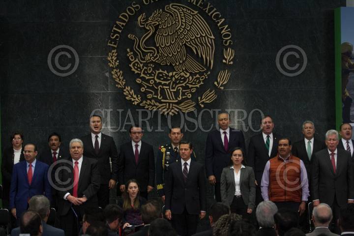 CIUDAD DE MÉXICO, 01MAYO2017.- Alfonso Navarrete Prida, secretario del Trabajo; Carlos Aceves del Olmo, líder del Confederación de Trabajadores de México, y Enrique Peña Nieto, Presidente de México, durante la celebración del Día del Trabajo en la residencia oficial de Los Pinos. FOTO: MOISÉS PABLO /CUARTOSCURO.COM