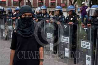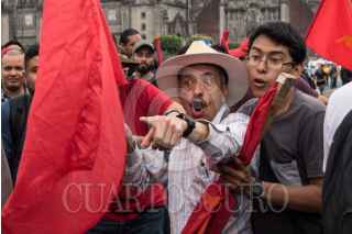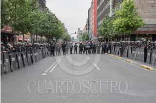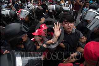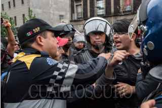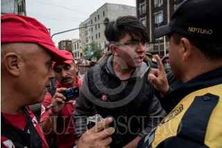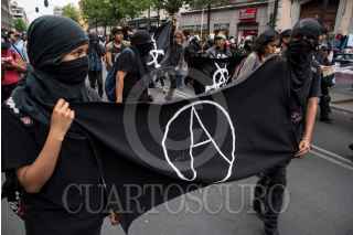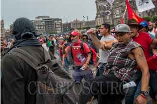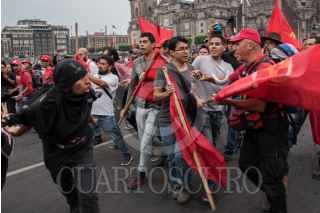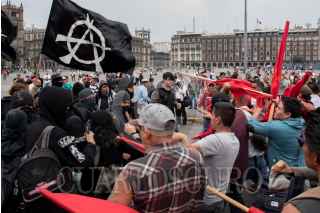 CIUDAD DE MÉXICO, 01MAYO2017.- Un colectivo de anarquistas y un grupo de comunistas, se enfrentaron a golpes al concluir la Marcha Anti Fascista en el Zócalo capitalino. Los hechos ocurrieron debido a que el grupo anarquista intentó tomar la palabra en el mitin y les fue negado, tras la negativa por parte de los comunistas, el bloque negro comenzó a cantar consignas interrumpiendo el mitin y fueron agredidos a golpes por parte del grupo de “rojos”. Policías capitalinos intervinieron y en una negociación con el grupo de derechos humanos Marabunta, acordaron dejar ir a los anarquistas y escoltarlos hasta metro Pino Suárez, con la condición de que un miembro de derechos humanos verificara que los anarquistas no portaban armas ni bombas. Al llegar a Pino Suárez Álvaro Sánchez “Neptuno”, jefe de operaciones de la policía, rompió el acuerdo e intentó detener a los jóvenes, sin embargo Marabuntas alegaron con los oficiales y lograron que los dejaran ingresar al metro y marcharse. FOTO: TERCERO DÍAZ /CUARTOSCURO.COM