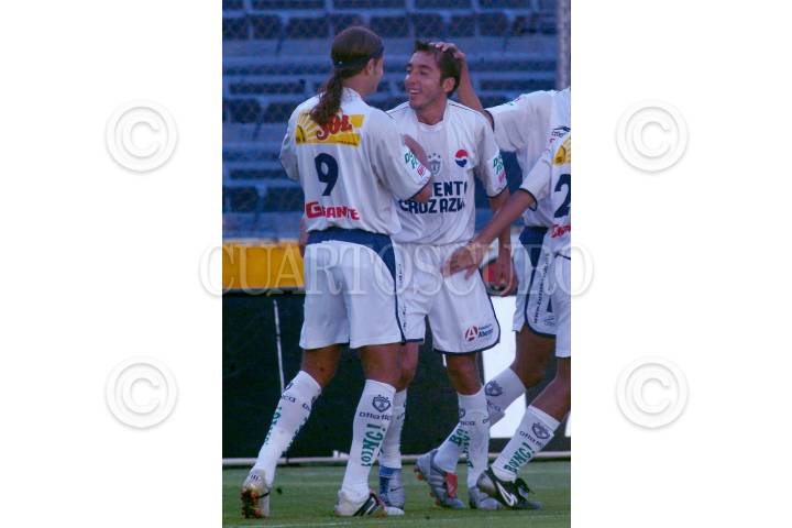 México, D. F. 28FEBRERO2004.- Enrique Meza, director técnico de Cruz Azul, le da instrucciones a Oscar el Conejo Pérez, luego de que por una falla del porteero el marcador le fue adverso a la máquina al inicio del juego ante Pachuca. El marcador final fue de 2 goles a uno favor Pachuca en el estadio Azul. FOTO: Iván Stephens/CUARTOSCURO.COM