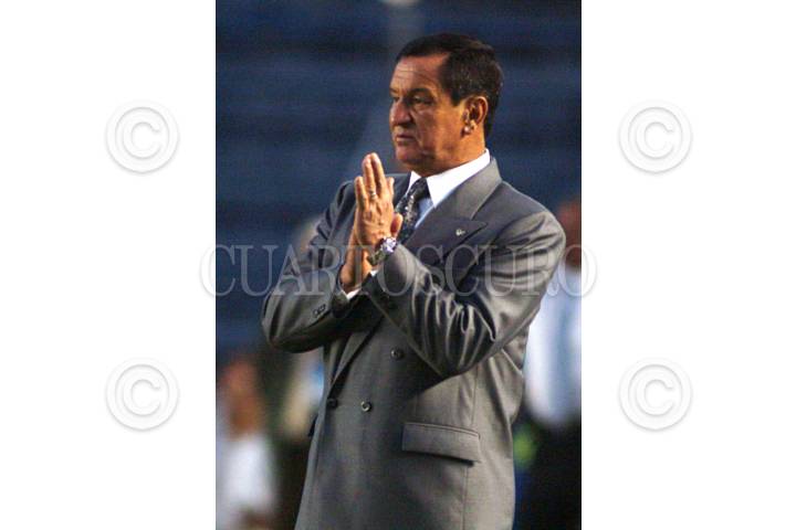 México, D. F. 28FEBRERO2004.- Enrique Meza, director técnico de Cruz Azul, le da instrucciones a Oscar el Conejo Pérez, luego de que por una falla del porteero el marcador le fue adverso a la máquina al inicio del juego ante Pachuca. El marcador final fue de 2 goles a uno favor Pachuca en el estadio Azul. FOTO: Iván Stephens/CUARTOSCURO.COM