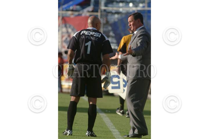 México, D. F. 28FEBRERO2004.- Enrique Meza, director técnico de Cruz Azul, le da instrucciones a Oscar el Conejo Pérez, luego de que por una falla del porteero el marcador le fue adverso a la máquina al inicio del juego ante Pachuca. El marcador final fue de 2 goles a uno favor Pachuca en el estadio Azul. FOTO: Iván Stephens/CUARTOSCURO.COM