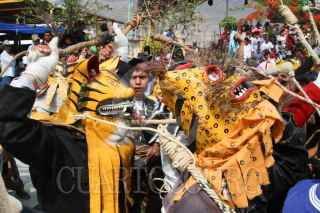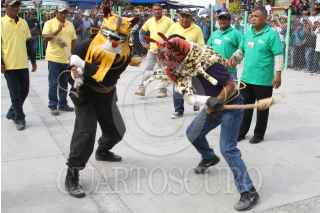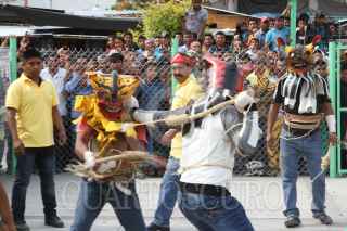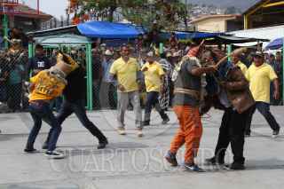 CITLALA, GUERRERO, 06MAYO2017.- Se llevó a cabo la ancestral “Pelea de Tigres” o ritual Atsatsilistli (petición de lluvias), donde se dieron cita los tres barrios tradicionales San Mateo, Cabecera y San Francisco en la explanada del Ayuntamiento Municipal del municipio de Zitlala. En este ritual, las personas preparan su reata curada con alcohol y mezcal, para que los golpes se han duros para sus contrincantes, algunos de los peleadores en esta ocasión acudieron sin camisa otros cubiertos con el traje típico que se utiliza. FOTO: BERNANDINO HERNÁNDEZ /CUARTOSCURO.COM