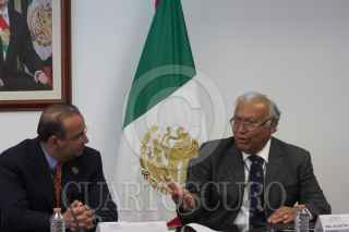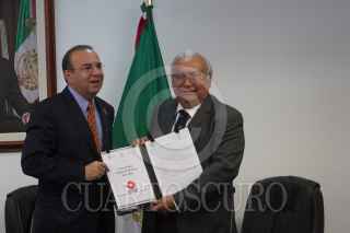 CIUDAD DE MÉXICO, 11MAYO2017.- Alfonso Navarrete Prida, secretario del Trabajo y Previsión Social (STPS), y Agustín Rodríguez, secretario general del Sindicato de Trabajadores de la Universidad Nacional Autónoma de México (STUNAM), durante la toma de nota del cambio de directiva del STUNAM periodo 2017-2020. FOTO: MOISÉS PABLO /CUARTOSCURO.COM
