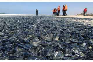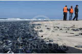 ROSARITO, BAJA CALIFORNIA, 11MAYO2017.- Miles de medusas velero aparecieron muertas en playas de Rosarito. Se trata de una especie molusca llamada medusas "Vella Vella o Medusa Velero" que se le conoce así porque “velea” en la superficie de los océanos. De acuerdo a investigadores su muerte de debe a causas naturales, ya que se trata de un fenómeno común en el mundo, y se le atribuye al cambio climatico.FOTO: CHRISTIAN SERNA /CUARTOSCURO.COM